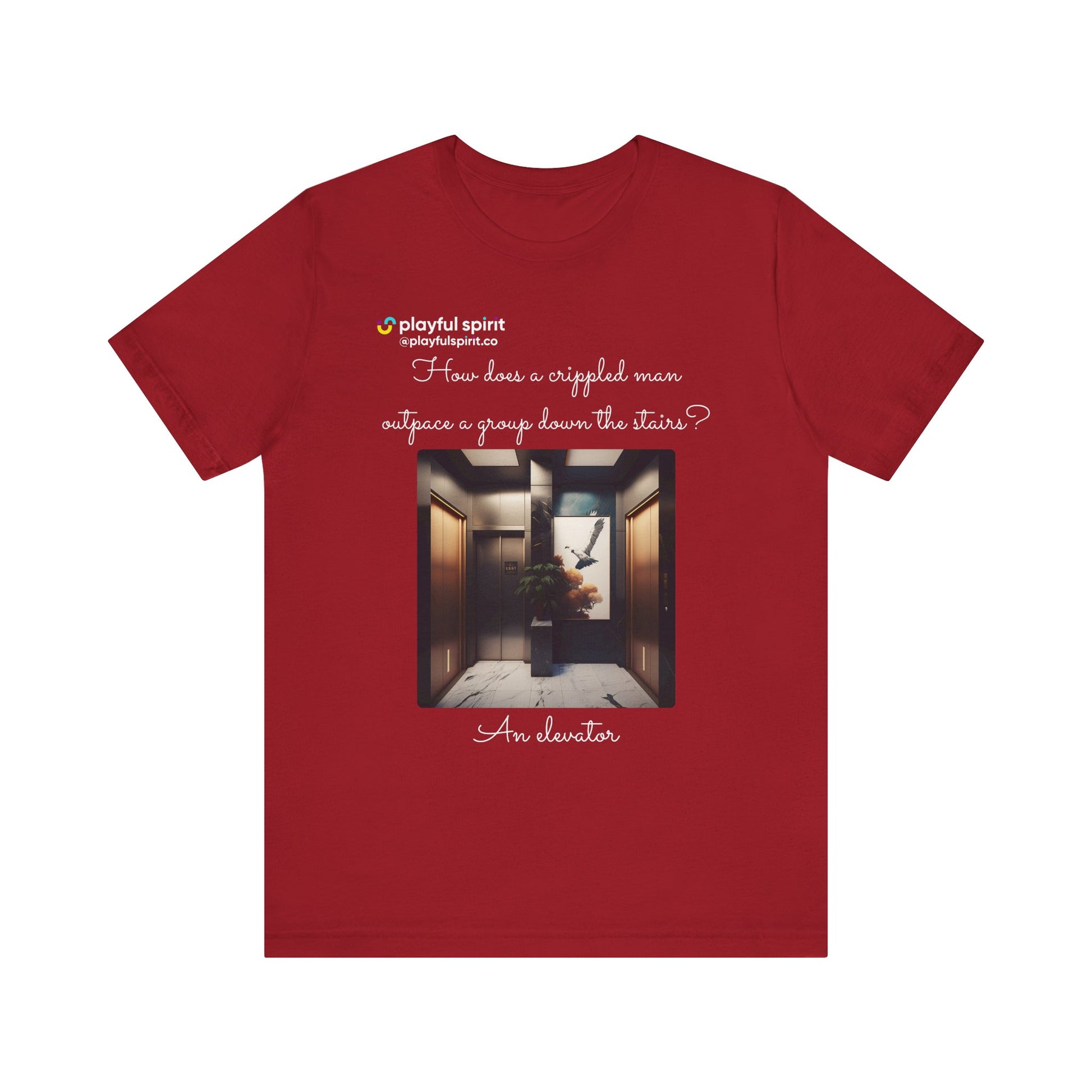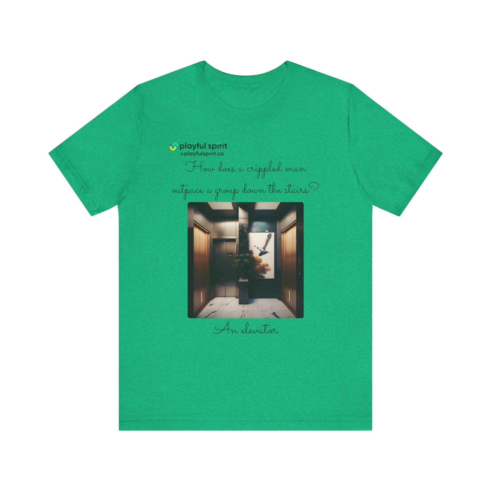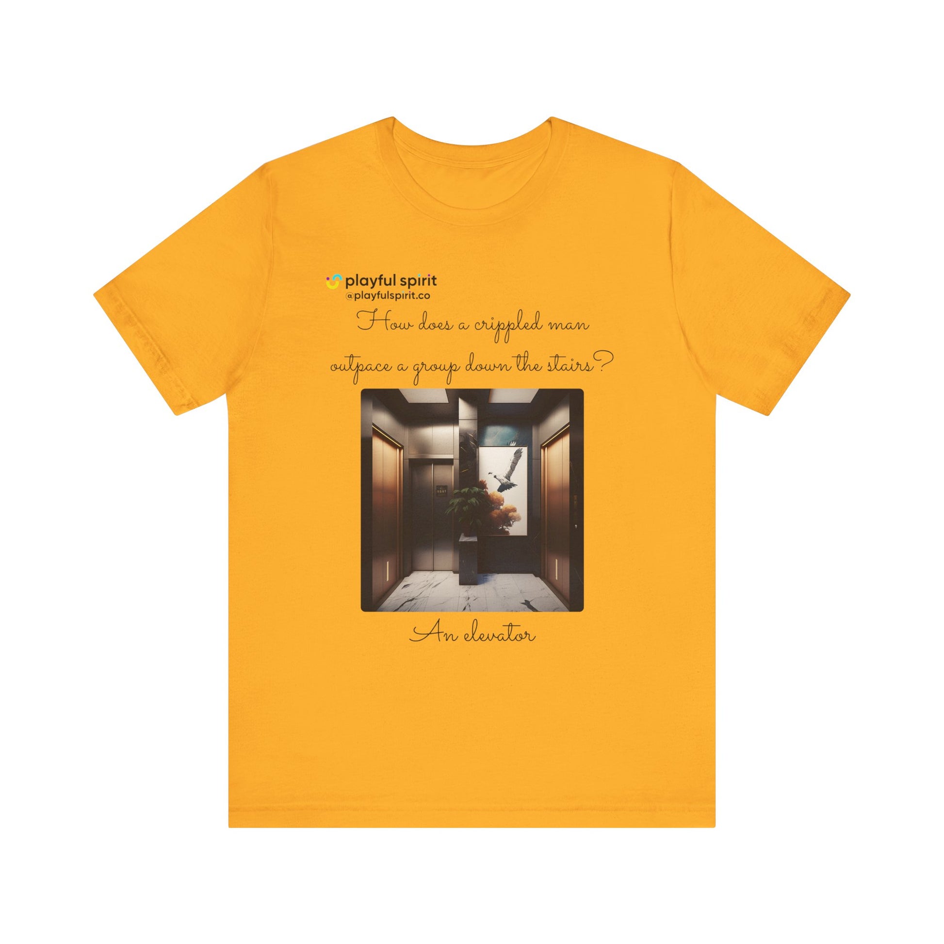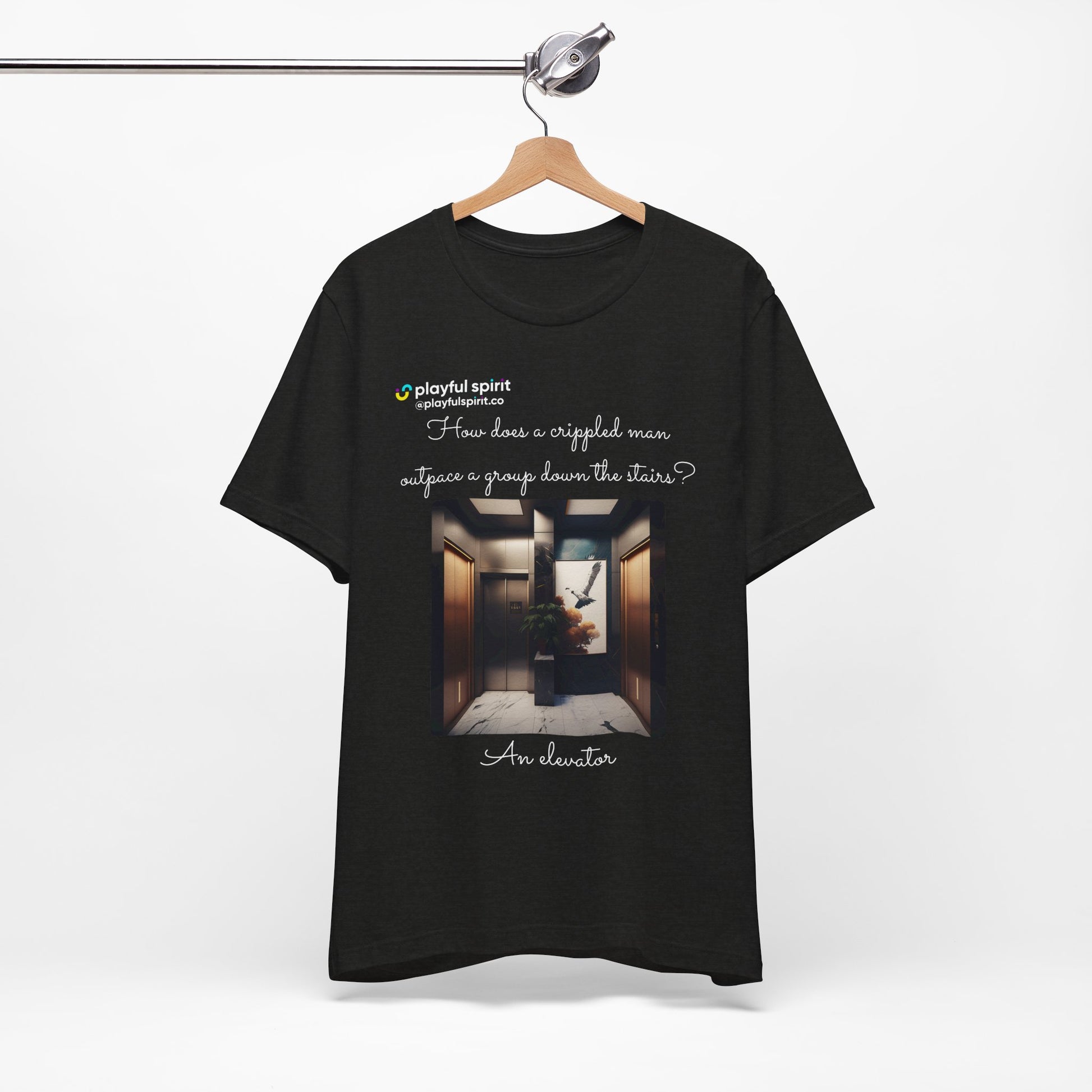 How does a crippled man outpace a group down the stairs? An elevator | Shirt