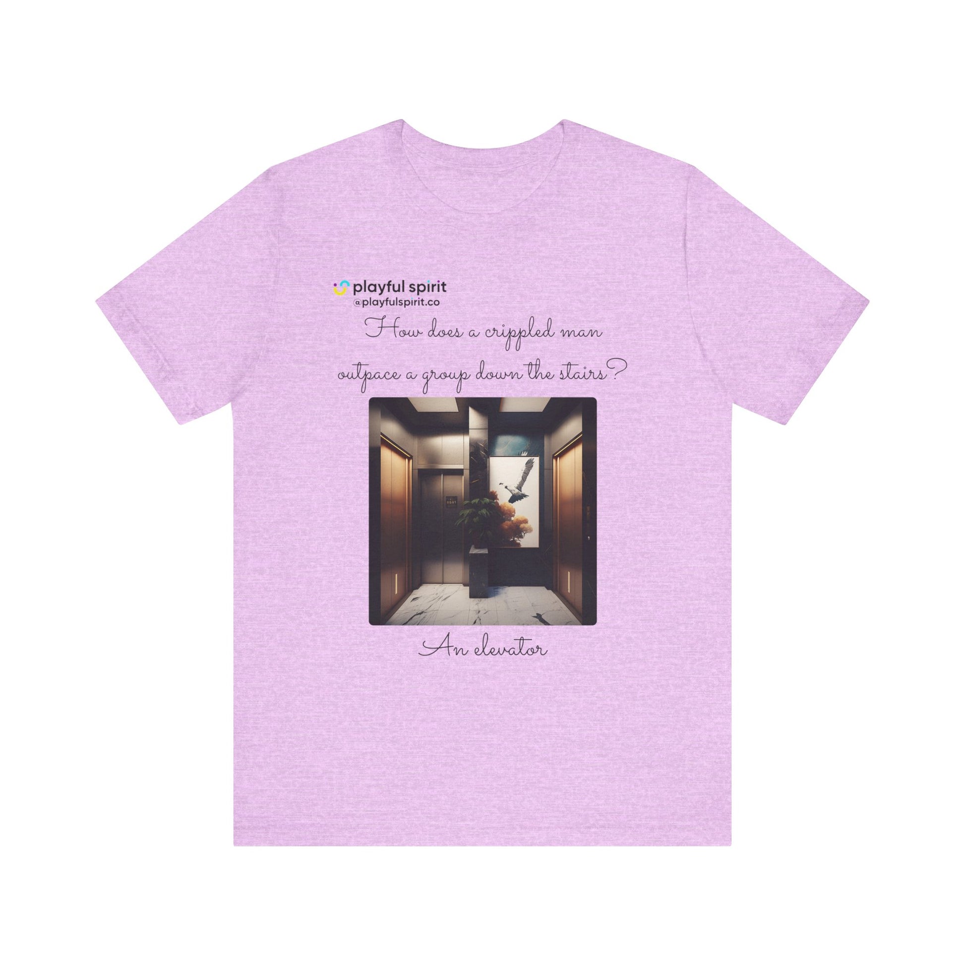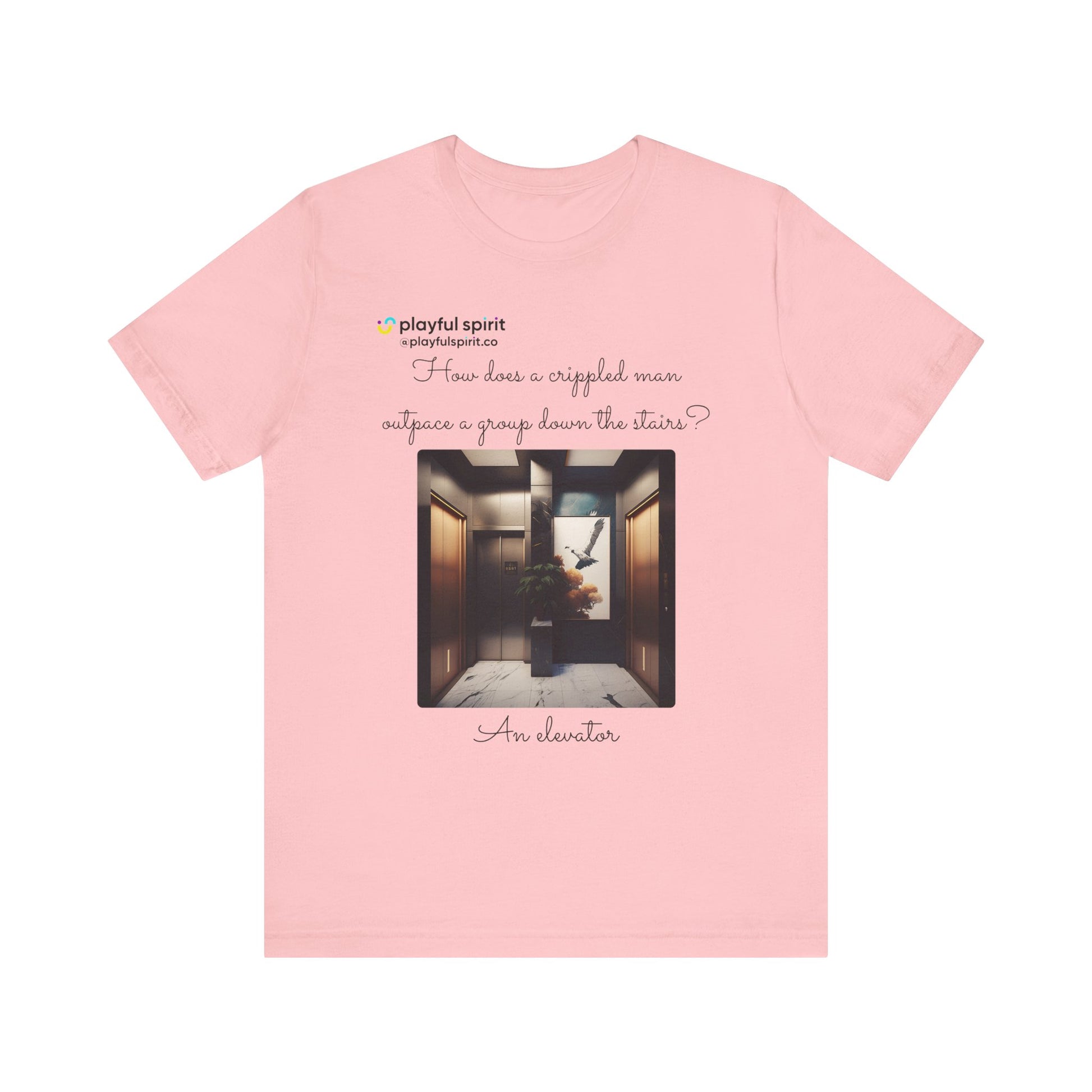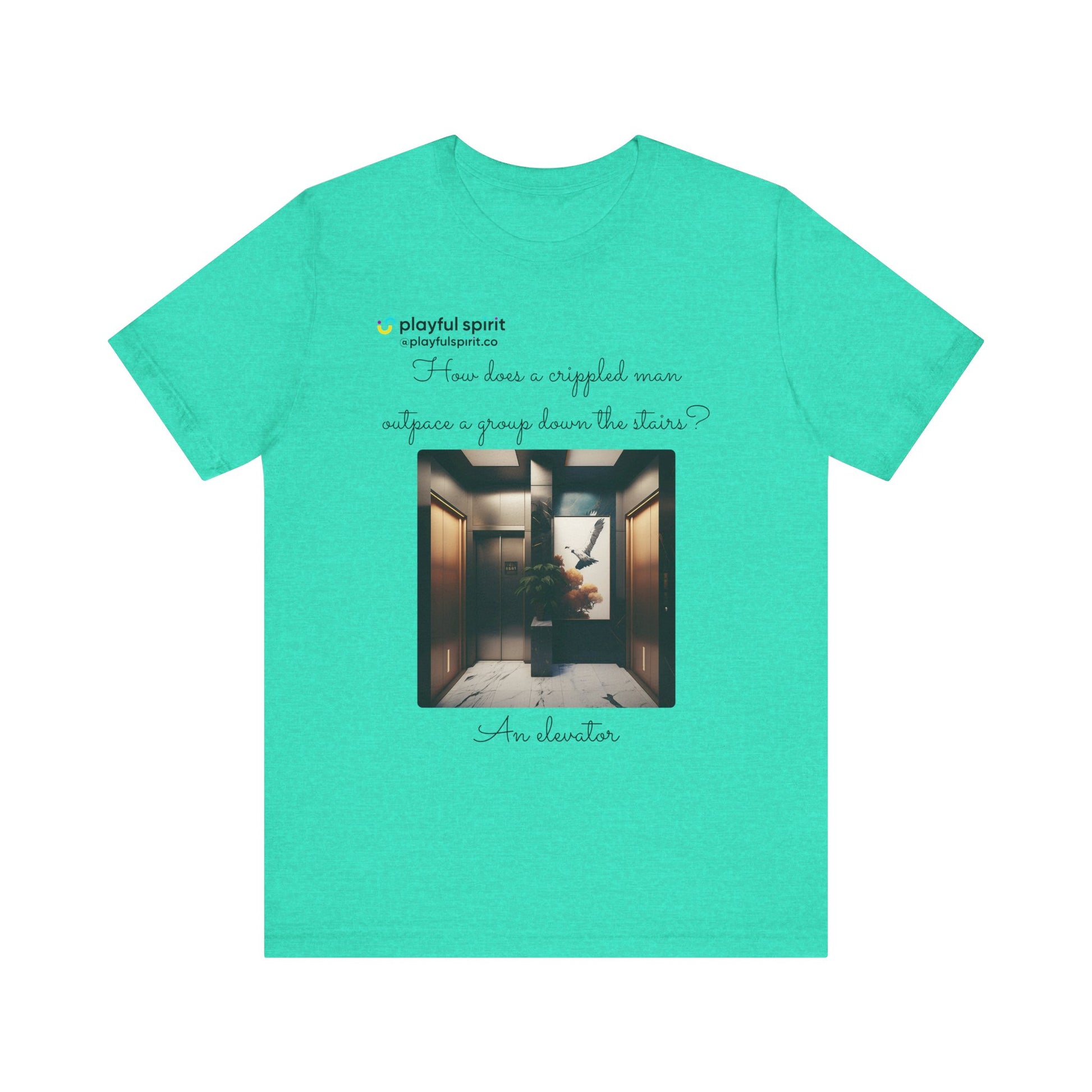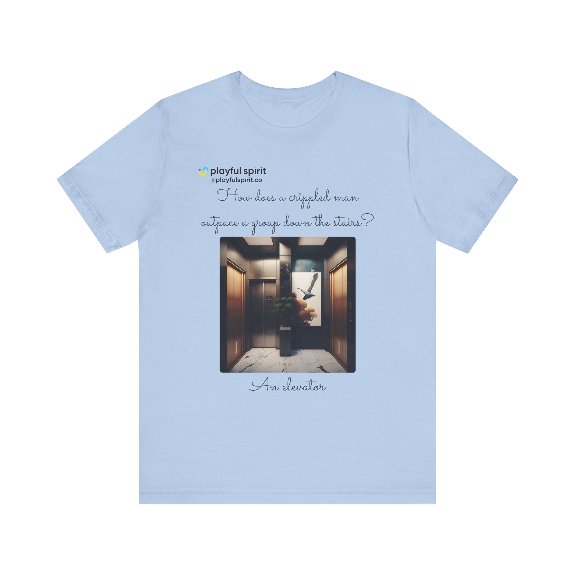 How does a crippled man outpace a group down the stairs? An elevator | Shirt